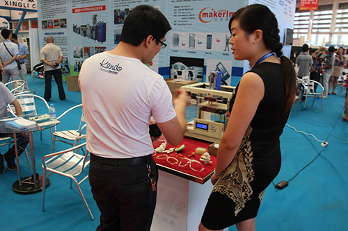 記者留意到,由創(chuàng)客聯(lián)盟帶來的“3D巧克力打印機(jī)”無疑是3D打印特裝區(qū)、乃至整個展會的“明星產(chǎn)品”。據(jù)了解,展臺上的這臺于2014年9月份生產(chǎn)的3D巧克力打印機(jī),是目前中國國內(nèi)推出的第一臺以3D打印技術(shù)為基礎(chǔ)的巧克力打印機(jī),這臺設(shè)備由青島尤尼科公司自主研發(fā)生產(chǎn),“很多人認(rèn)為3D打印技術(shù)高不可及,但它的產(chǎn)品已確確實實地來到了我們的身邊,來到了我們的生活當(dāng)中。”創(chuàng)客聯(lián)盟工作人員給記者介紹了3D巧克力打印機(jī)的使用方法:“首先在機(jī)器投放巧克力粉,然后在電腦設(shè)計你需要的產(chǎn)品圖案,將設(shè)計方案輸入到該3D打印機(jī),機(jī)器會通過3D打印技術(shù)自動將你的2D設(shè)計方案立體化生產(chǎn)。工作人員說:“以前,在傳統(tǒng)蛋糕店只能用奶油給客戶在蛋糕上手寫名字,在市面上售賣的巧克力也是批量生產(chǎn),缺乏特色,但通過3D巧克力打印機(jī),家長可根據(jù)小孩子的喜愛,隨意塑造任何字體和圖案,打造一份屬于自己的巧克力,是真正做到定制生產(chǎn)的概念。”此外,創(chuàng)客聯(lián)盟還介紹到,生產(chǎn)商會對買家進(jìn)行設(shè)計培訓(xùn),買家不需要設(shè)計師也可真正做到DIY巧克力產(chǎn)品制作。